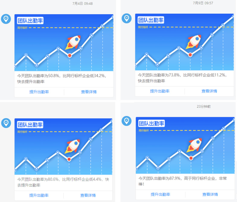 關(guān)于本月新擬定下發(fā)試實(shí)行的考勤制度,員工都非常認(rèn)可此次制度,從行動上來做出最好的支持。雖然從擬定好考勤制度,到最初步的下發(fā)執(zhí)行,到現(xiàn)在雖然才半月有余,但是整體的考勤情況呈現(xiàn)出一個穩(wěn)步提升的趨勢。見下圖: